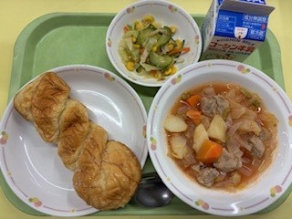 給食時間にクラスを回ると「揚げパンおいしい」「甘くておいしい」と、みんな一所懸命に食べていました。