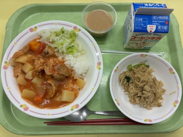 給食では、ご飯、豚肉と野菜のトマト煮込み、キャベツサラダを1つのお皿に盛っていただきました。