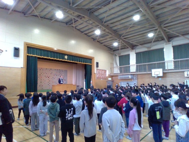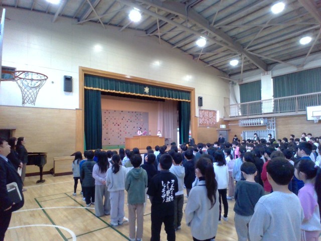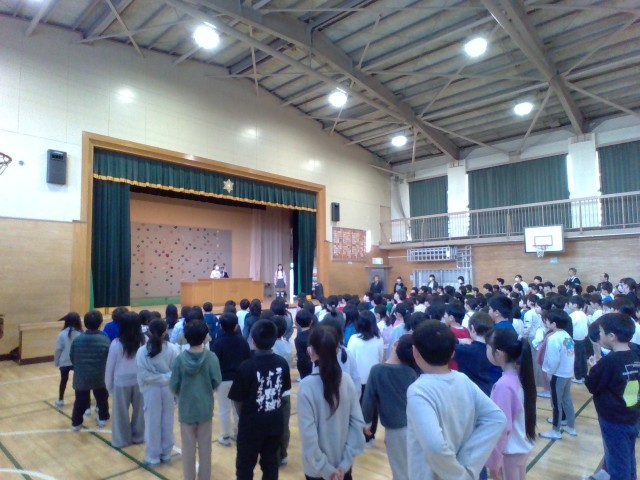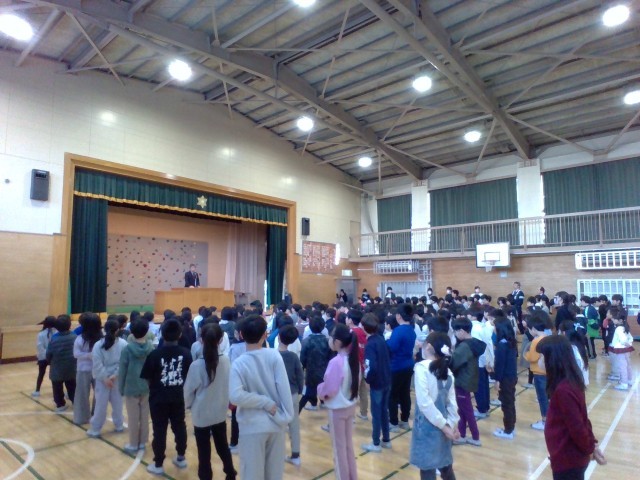 校長先生からは、3学期の校庭の使い方について話がありました。今年度は校庭改修が夏から始まり、体育や休み時間に校庭が使えませんでした。予定通りいくと、1月か2月ごろ校庭が使えるようになるそうです。新しくなった校庭で、どんなことをしたいか、冬休みに考えてみてくださいという話がありました。