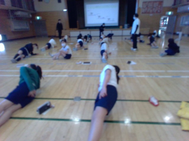 2組のみなさんも、オンライン授業として参加しました。また、本日取り組んだストレッチをまとめたプリントもいただいたので、今後も活用していき、健やかな成長と安全につなげていきたいと思います。