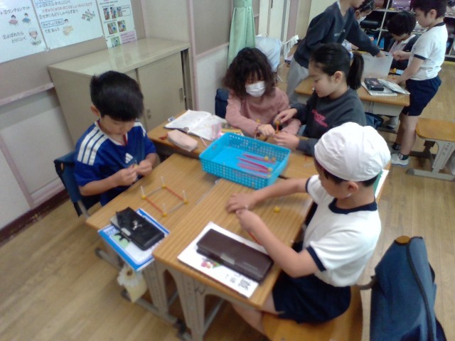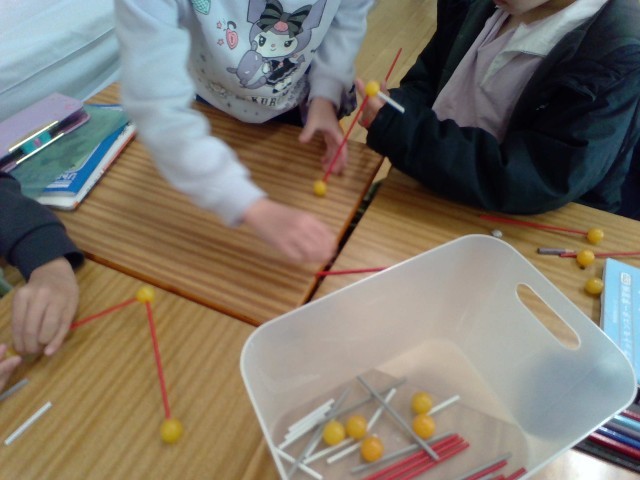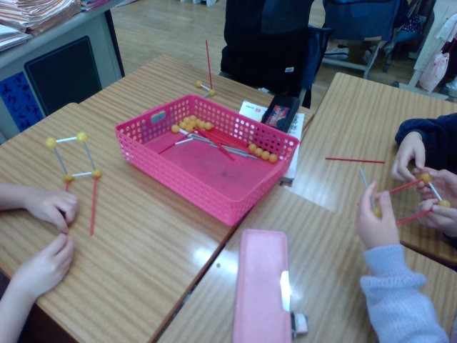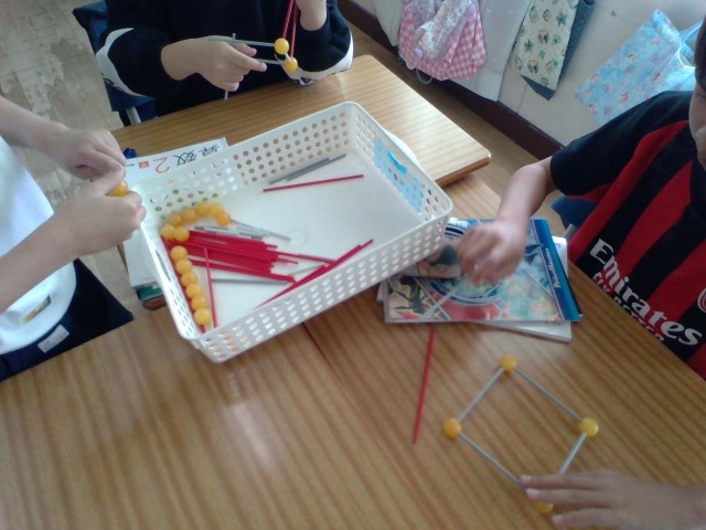 今日はボールとひごを使って箱の形を作る学習をしました。グループで相談しながら作ることができました。