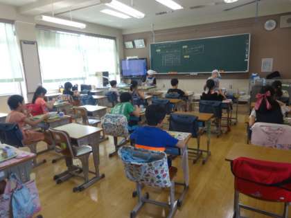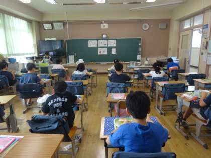 3ヶ月ぶりの給食です。配膳は、先生が行いました。献立は、肉どんぶりとゼリー、牛乳。みんなおいしそうに食べていました。