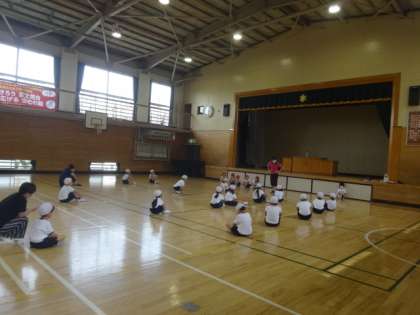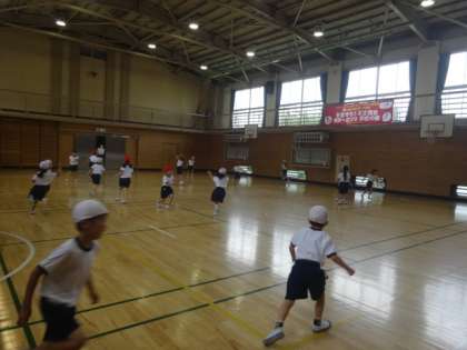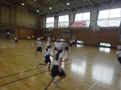 1年生の体育の様子です。体育館で行いました。先生からルールを聞きました。その後、おにごっこをしました。おもいきり体を動かしてうれしそうでした。