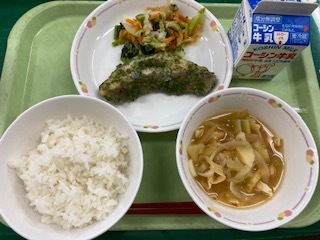 磯辺揚げは、のりが入った衣で作る天ぷらです。給食では、青のりを入れて作りました。