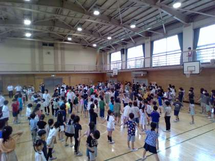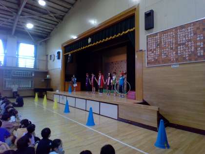 今日の集会は、各クラス対抗のフラフープくぐりです。みんなで手をつなぎフラフープをくぐっていき、どのクラスが速かったかを競います。少し遅れているクラスには他のクラスが拍手で応援する姿も見られ、みんな安全に気をつけて、笑顔で楽しむことができました。