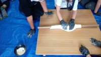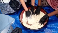 9月26日ほうとうづくり体験です。小麦粉をこぼさないように、水を加えて混ぜていき...