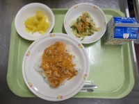 お豆のカレーライス 和風サラダ プルーン 牛乳