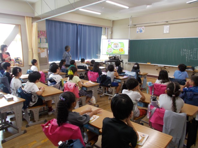 毎月19日は食育の日です。今日は「かむかむメニュー」をとりいれています。きびなごは骨が柔らかく頭からしっぽまで食べられます。しっかりかむので顎や歯が強くなります。今日は4時間目に日本女子大学食物学科栄養学部の学生さんが授業参観にいらっしゃいました。4時間目の道徳の授業 体のことを考えて(健康を守る)「かむかむメニュー」の授業を行いました。噛むときにはどこが動くのか頭や顔を触る体験をしながら、みんなしっかり話を聞いていました。