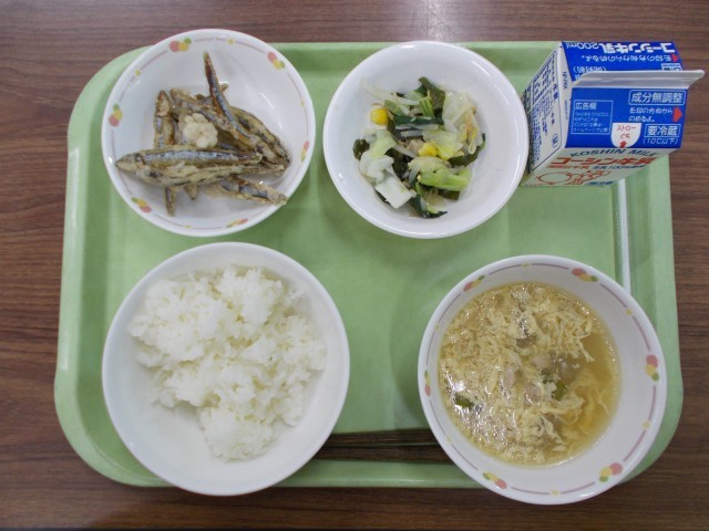 ごはん きびなごのから揚げ 冬瓜のかきたま汁 わかめサラダ