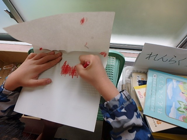 図工の学習で「こすりだした かたちから」に取り組みました。教室の中のいろいろな物の表面を、色鉛筆でこすりだして模様を探しました。宿題提出用のかご、椅子の横、色鉛筆の箱など、身の回りには面白い模様がたくさん。子供たちは夢中になって模様を見つけ、楽しそうに活動していました。