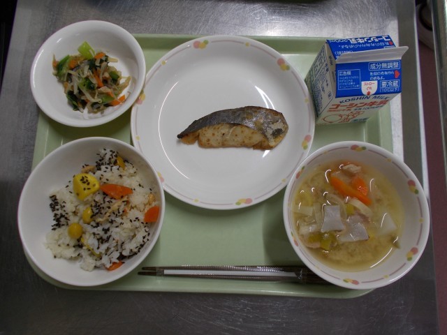 吹き寄せおこわ 芋いも汁 魚のみそ幽庵焼き おろし和え