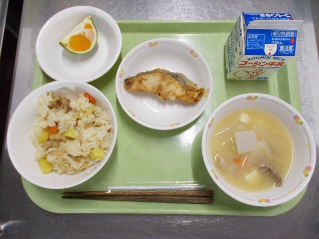 秋の香りご飯 田舎汁 鰆のみそ漬け焼き はやか 牛乳