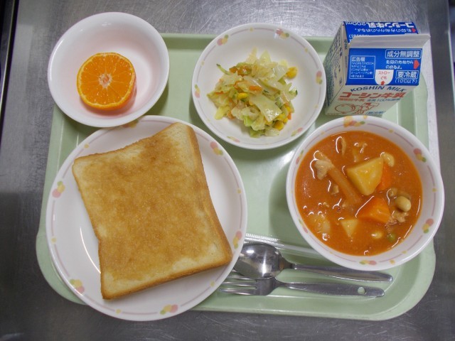 シナモントースト トマトシチュー コーンサラダ クレメンティ 牛乳