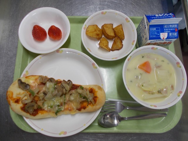 ナンピザ 白菜のクリームシチュー スパイシーポテト いちご 牛乳