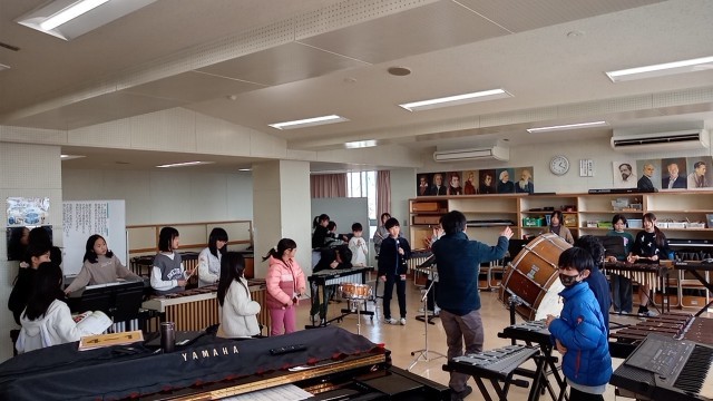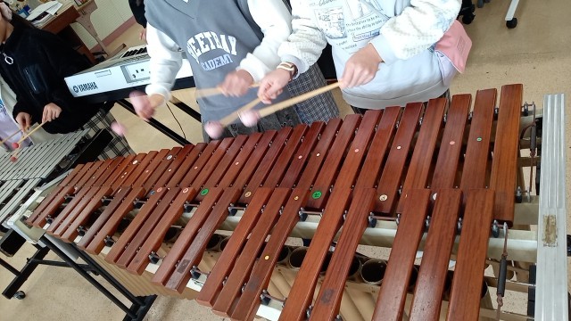 茶色のこびんの合奏を、グループに分かれて練習をしています。