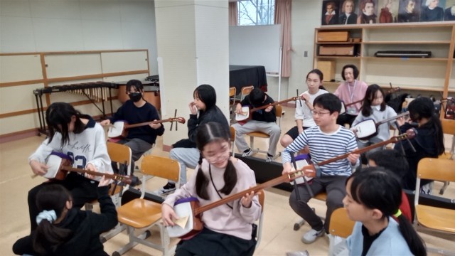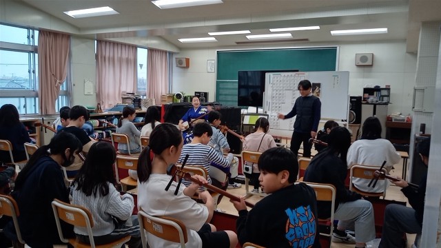 思い思いに音を出していきました。子供たちは、真剣にそして楽しく三絃教室を行いました。