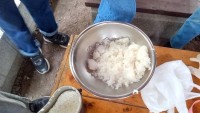 9月26日ほうとうづくり体験です。小麦粉をこぼさないように、水を加えて混ぜていき...