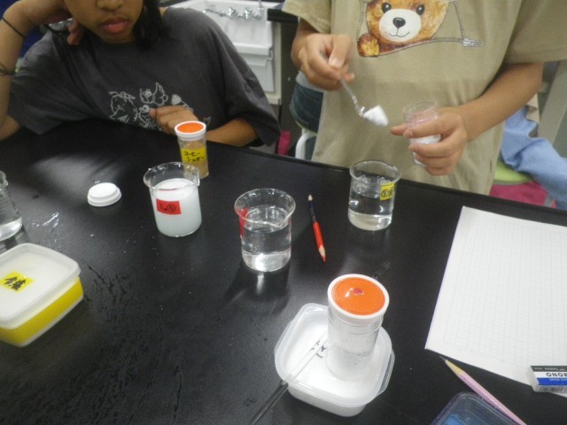 でんぷんや塩、コーヒーシュガーなどを溶かして、どれが溶けている状態(溶解)なのかを確認しました。