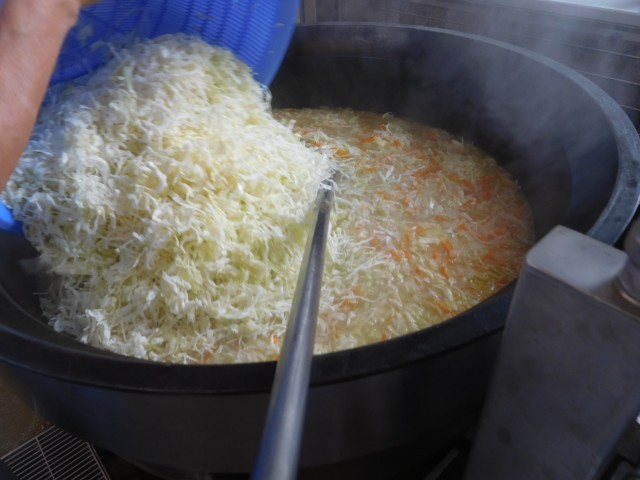 写真3枚目は「ジュリエンヌスープ」に千切りキャベツを入れている様子です。