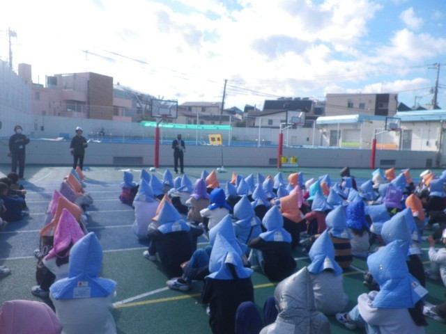 11月の避難訓練を行いました。今回は、大きな地震が発生し、学校西側で火災が発生したという想定です。