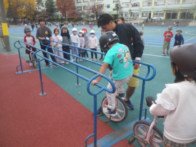 今週から、校庭で一輪車で遊べるようになりました。怪我がないようにヘルメットと手すりにつかまって挑戦しています。