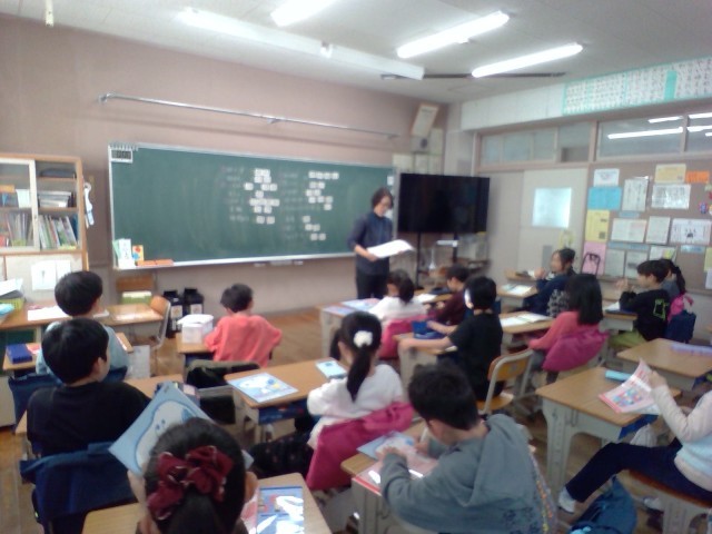 担任が読み聞かせをしたり、児童が冬休みの思い出を発表していたりしています。
