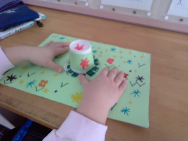 画用紙や紙コップに好きなキャラクターやイラストを描いています。