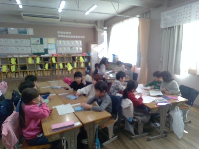 1年生は算数の時間に、たし算やひき算を使った問題づくりをしています。