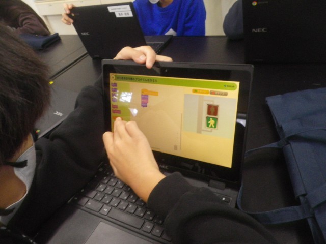 6年理科「私たちの生活と電気」という単元で、プログラミングに挑戦しました。