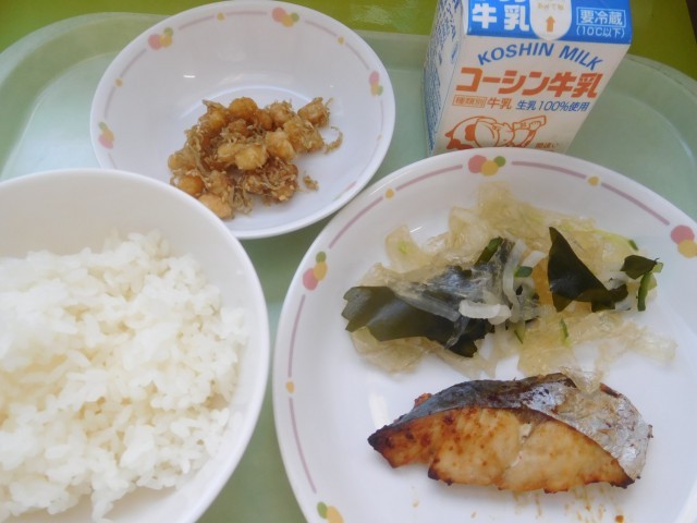 ごはん・魚のにんにくじょうゆ焼き・寒天わかめサラダ・ぎすけ煮・牛乳