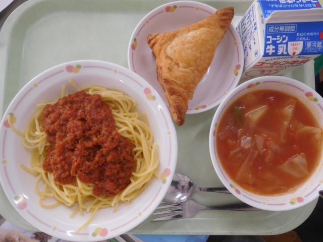 スパゲッティミートソース・ミネストローネ・ストゥルーデル(アップルパイ)・牛乳