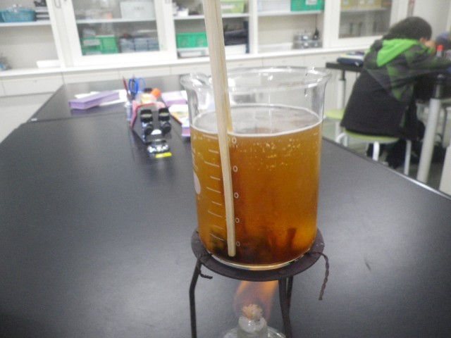 試験管の下のほうに火を当てているのにも関わらず、上のほうから示温インクが変化し、ビーカーの中のコーヒーは温まると回転を始めました。