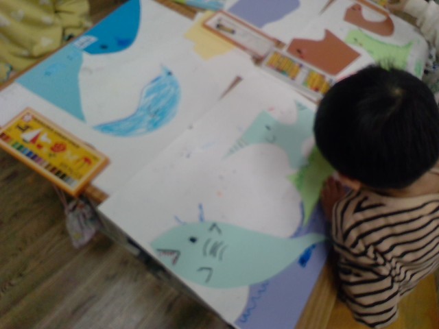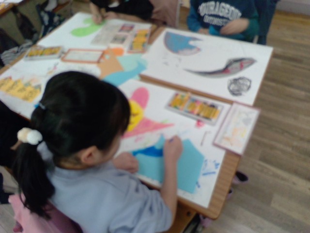さまざまな形をした紙からイメージを広げて、思い思いのものを描いています。
