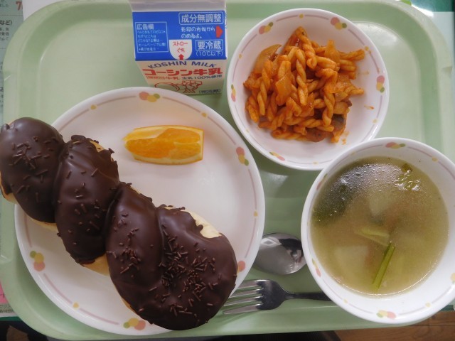チョコがけパン・野菜スープ・マカロニソテー・清美オレンジ・牛乳