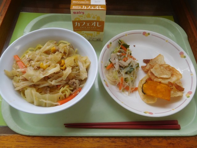 みそラーメン・春雨サラダ・野菜チップス・コーヒー牛乳