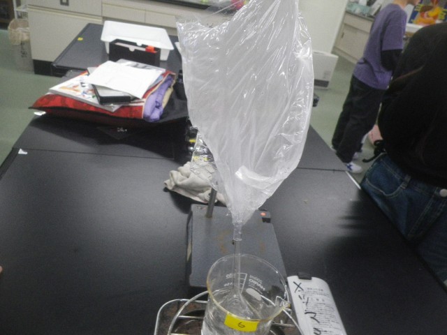 また泡を袋に集めると、袋が水にぬれていました。このことから、水は熱せられると気体に姿を変え、冷やされると水に戻ることが分かりました。
