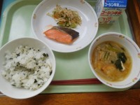 ごはん・和風豆腐ハンバーグ(きのこおろしソース)・わかめじゃこサラダ・きなこ豆・牛乳