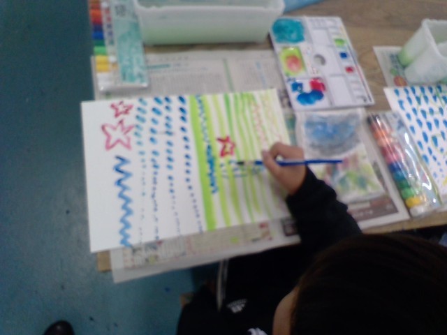 黄緑や青、赤などの色を使い、線を引いたり、模様を描いたりしています。