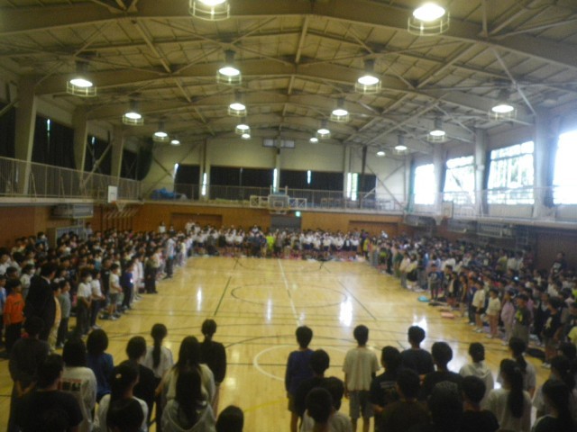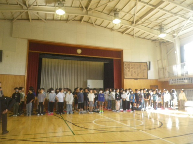 音楽朝会で校歌をうたいました。はじめに6年生が代表で歌い、それから全校児童で歌いました。