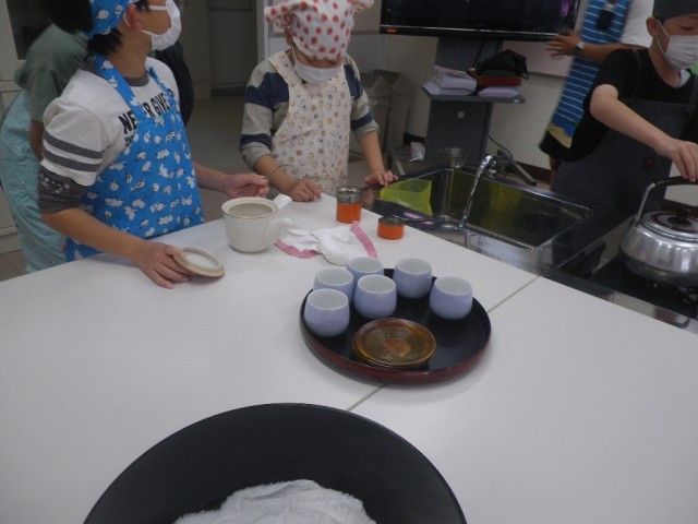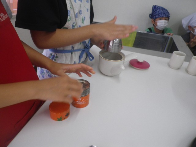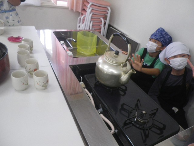 5年生が家庭科の時間にお茶をいれる学習をしました。火を扱うので、安全に注意しながらやかんでお湯を沸かしていました。