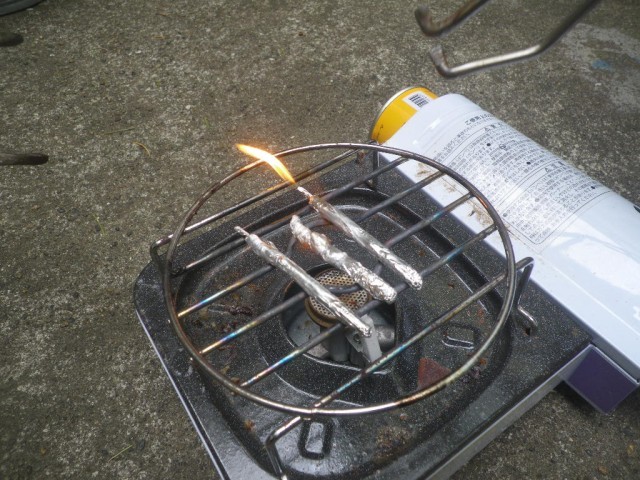 割り箸をアルミニウムで包んで火にかけると白い煙が出て、炭になりました。