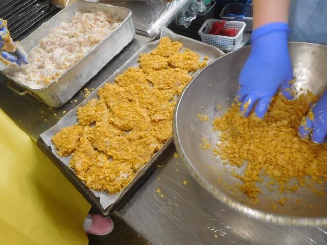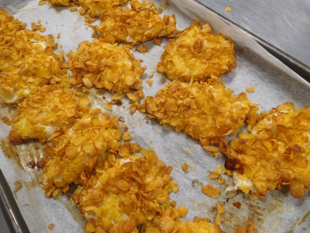 初登場「鶏肉のコーンフレーク焼き」は鶏肉をマヨネーズに漬け込み柔らかくし、コーンフレークを付け焼いています。
