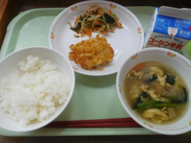 ごはん・鶏肉のコーンフレーク焼き・中華ツナサラダ・たまごスープ・牛乳