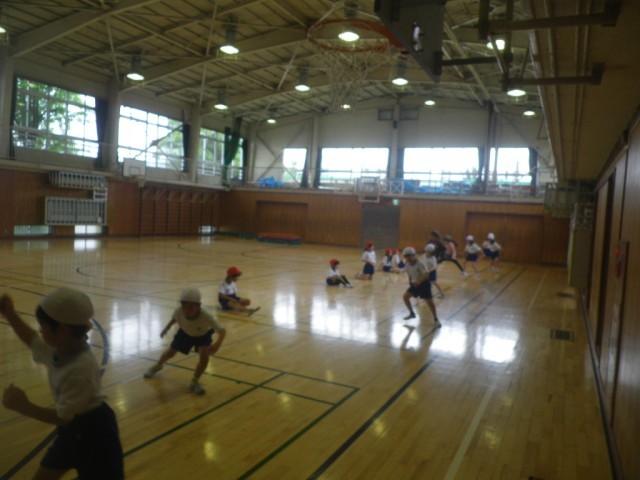 2年生の子ども達は、体育館で反復横跳びの練習をしていました。あいにくの雨で外遊びができなかったので、ありあまる元気をスポーツで発散していました。