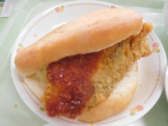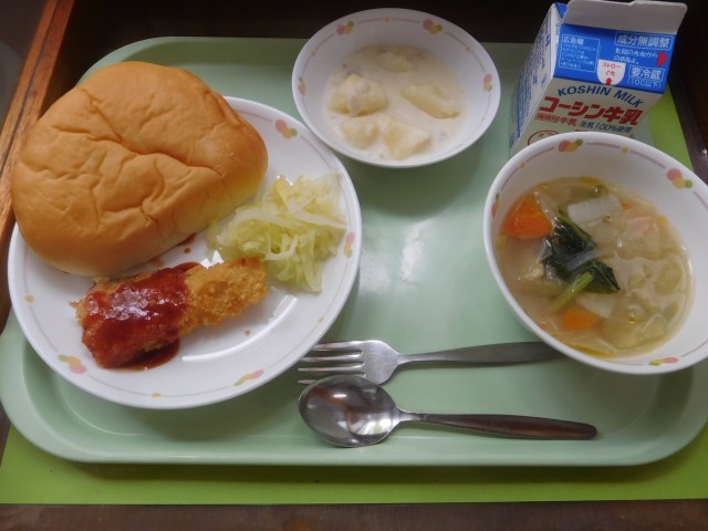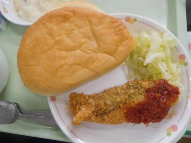 セルフフィッシュバーガー・じゃがいものミルク煮・ABCスープ・牛乳