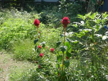 ○写真上 ケイトウ 真っ赤な派手な花を咲かせています。緑が多く地味な色の多い学校園ではひときわ目立っています。