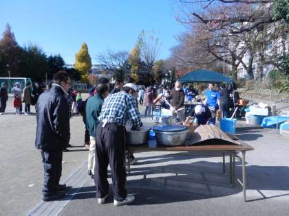 晴天の中、高松二丁目町会青年部による「お餅つき」が高松小学校の校庭で行われました。