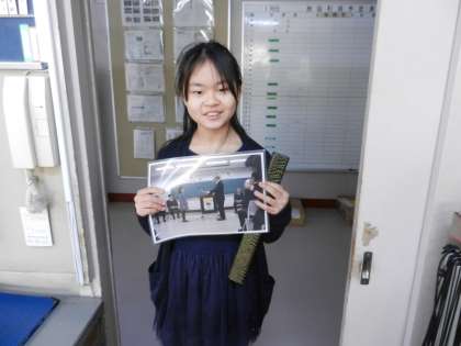 改めて学校でも、始業式の後、全校の子どもたちに受賞を紹介すると共に表彰しました。写真は、始業式後に職員室に来た小澤さんです。小澤さんが持っている写真は、1月6日の表彰式の時に、豊島区の職員の方が撮影してくれた写真をプリントアウトしたものです。