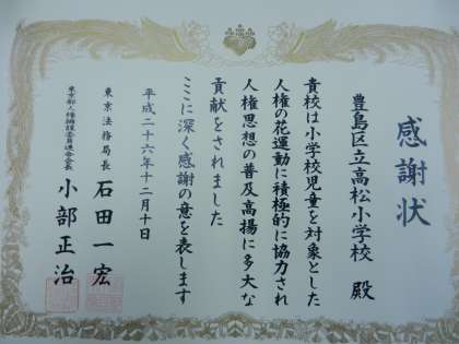 ○写真左:「人権の花運動」で感謝状をいただきました。
