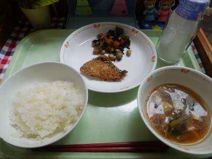 魚のゆず味噌焼きは、丁寧に下味をつけ焼きました。五目豆は、大豆・こんにゃく・ひじき・ごぼう・にんじんを入れました。田舎汁は具だくさんにして栄養満点です♪